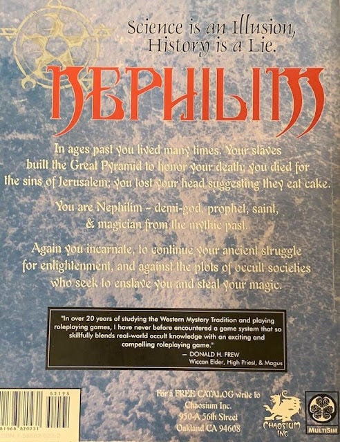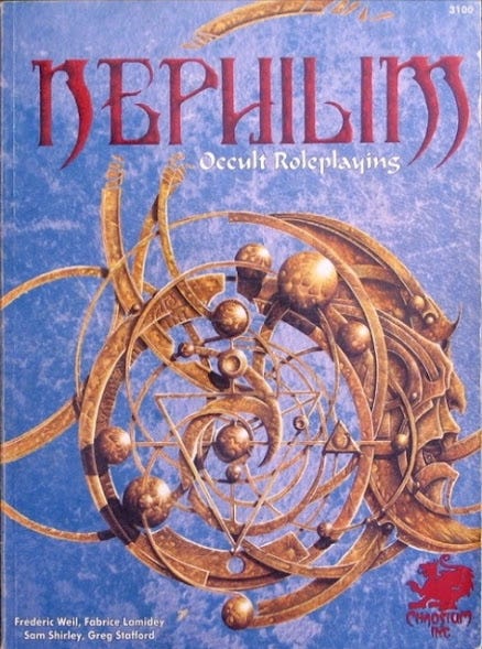 In many ways, Nephilim is the Platonic ideal form of the RPG-ULTRA role-playing game, since it stomps all over the leftover Tolkienisms of Dungeons & Dragons, and goes straight for the occult mind-control jugular: